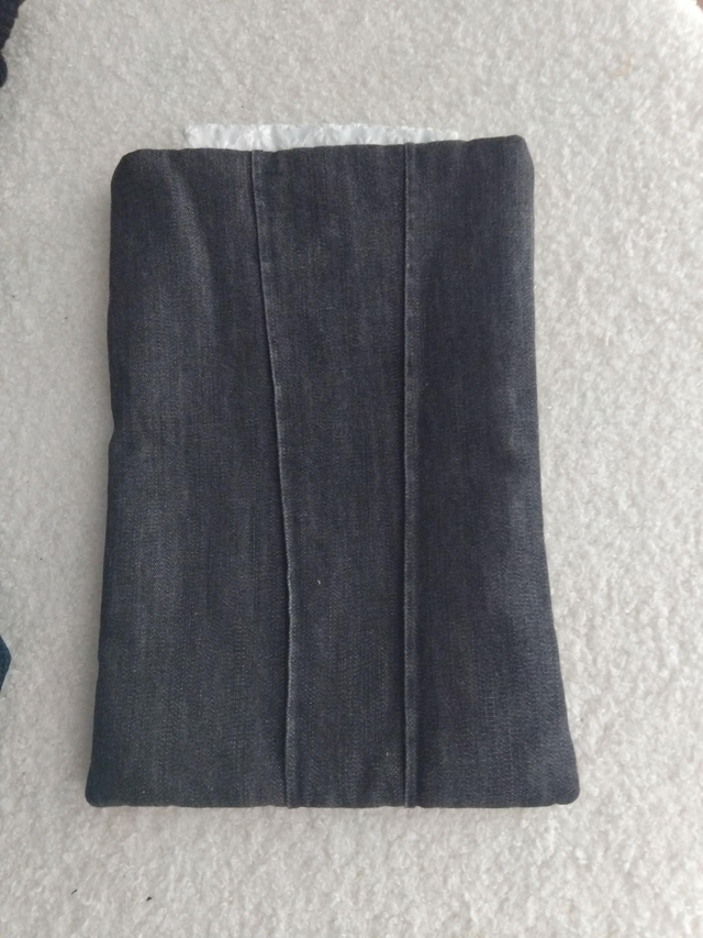 Cette housse légèrement molletonnée peut contenir un livre de poche. Elle a été créé avec une chemise en jean recyclée et quelques chutes de tissus.