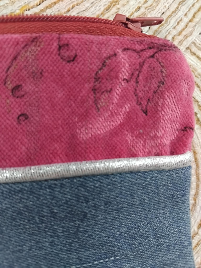 Trousse upcyclée à partir d'un vieux jean préalablement lavé et d'une robe pour enfant de marque "KENZO", on y ajoute quelques matériaux et accessoires et la voilà partie pour une nouvelle vie !!!